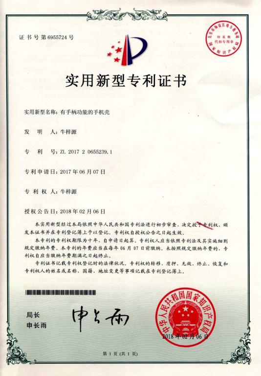 近日,从国家知识产权局获悉,best365手机版官方网站2014级机械设计制造及其自动化专业牛梓源同学设计发明的《有手柄功能的手机壳》获批国家实用新型专利证书(专利号:ZL201720655239.1)。