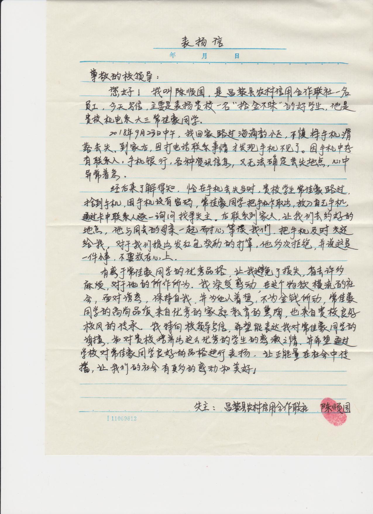 2018年9月26日,best365手机版官方网站收到昌黎县农村信用合作联社员工送来的表扬信,对best365手机版官方网站16级机制专业常佳豪同学帮助找寻手机,坚决不收红包的行为表示感谢,对best365官网良好校风表示赞扬。昌黎县农村信用合作联社员工因丢失手机异常着急,常佳豪同学路过并拾到手机,与失主家人取得联系,第一时间将手机归还,并多次拒绝失主的红包奖励,最后在失主的一再追问下才告知了学校名字和自己的姓名。失主随即来到best365手机版官方网站,将感谢信送到该院领导手中,这时大家才知道该院学生拾金不昧暖人心的感人事迹。