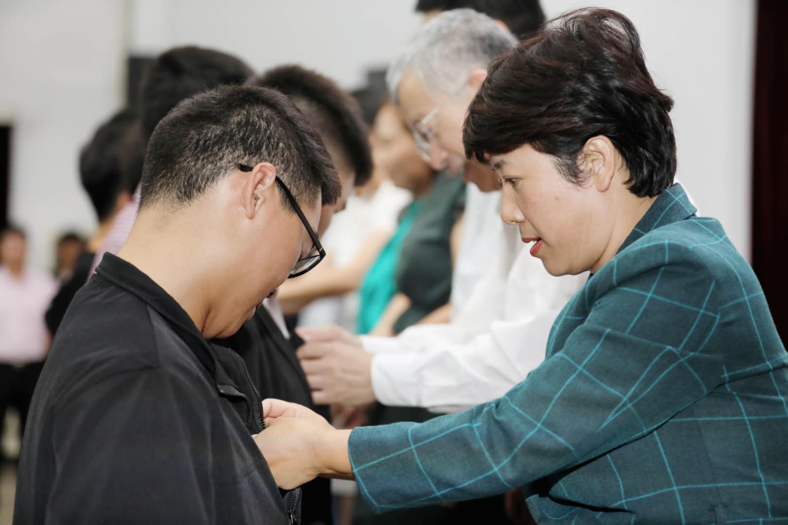 与会的教师代表还为新生代表佩戴了校徽,新生代表向2018级新生班主任老师献上鲜花。有助于增进师生间的交流互动,使新生能够尽快在心里产生家的归属感和亲切感,以便更快、更好地适应大学生活,明确大学学习目标,同时也为未来的学习生活工作奠定了良好开端、打下了坚实基础。