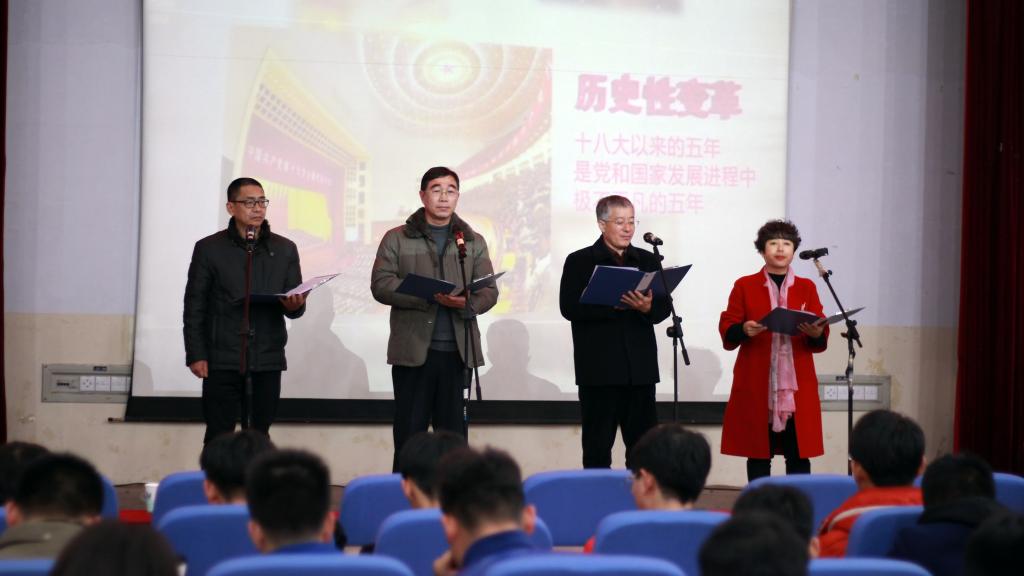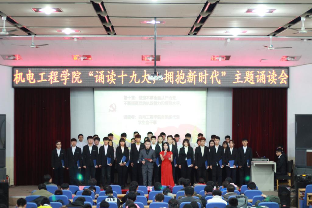 2017年12月20日下午,best365手机版官方网站在昌黎校区学术报告厅举办了“诵读十九大,拥抱新时代”——十九大报告(节选)诵读会。机电学院领导班子成员、教师党员代表、学生党员、入党积极分子等600余人参加了本次诵读会。