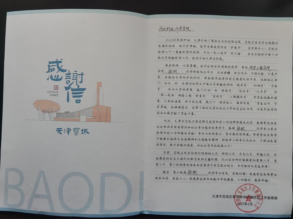近日,best365手机版官方网站19机制张帆同学因在属地积极投身疫情防控志愿者队伍,天津市宝坻区疫情防控指挥部特发来感谢信。